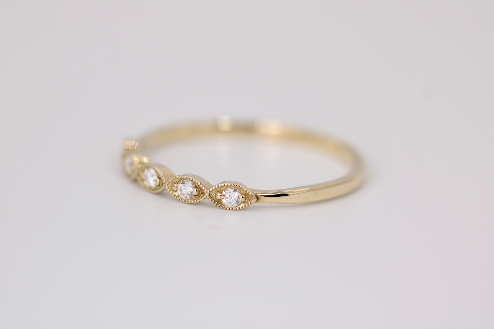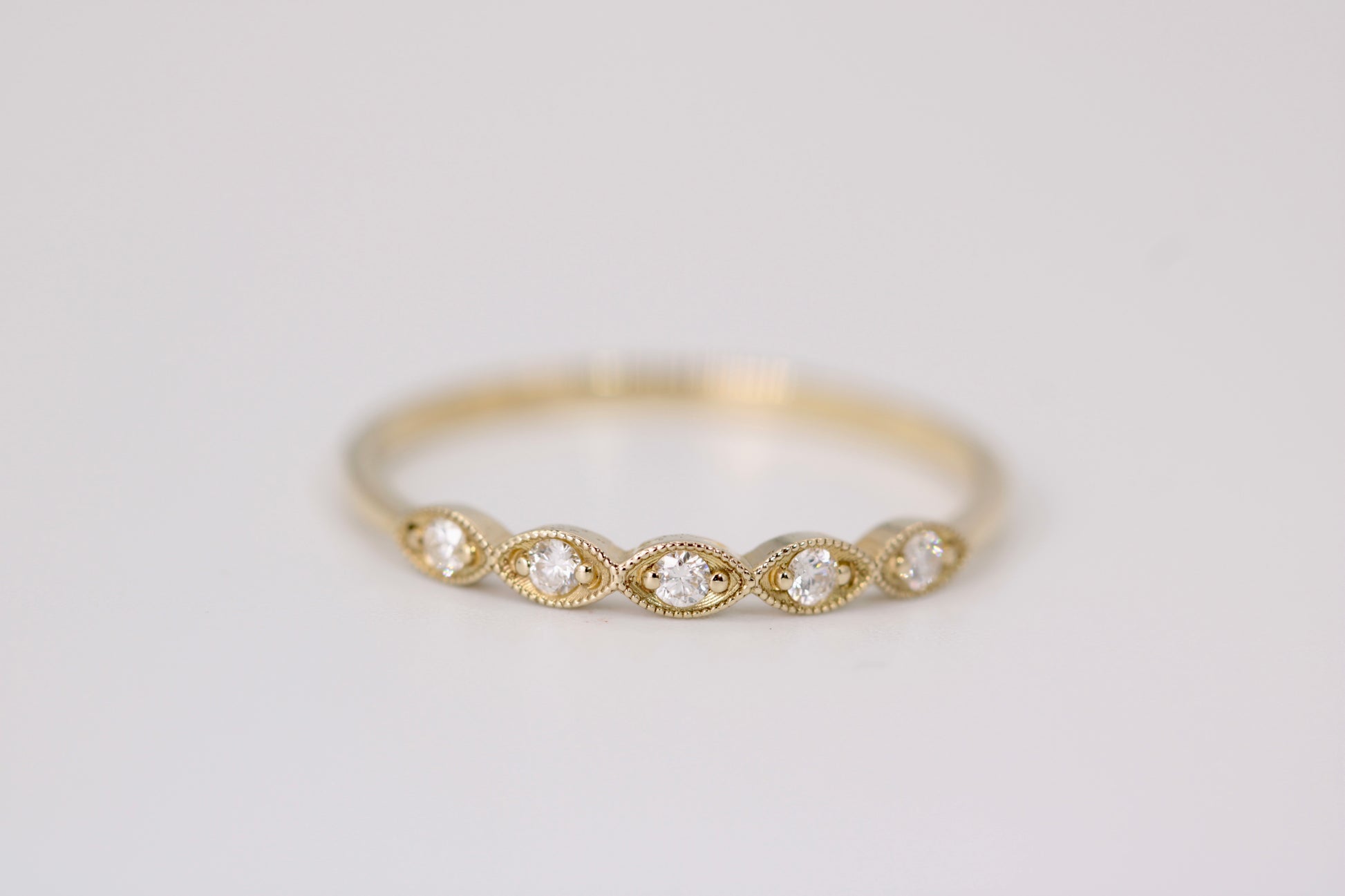 14k yellow gold ring featuring five round diamonds within a marquise-shaped setting. Designed for stacking, this ring offers refined elegance and versatility. Its milgrain edge enhances the sparkle of each diamond.