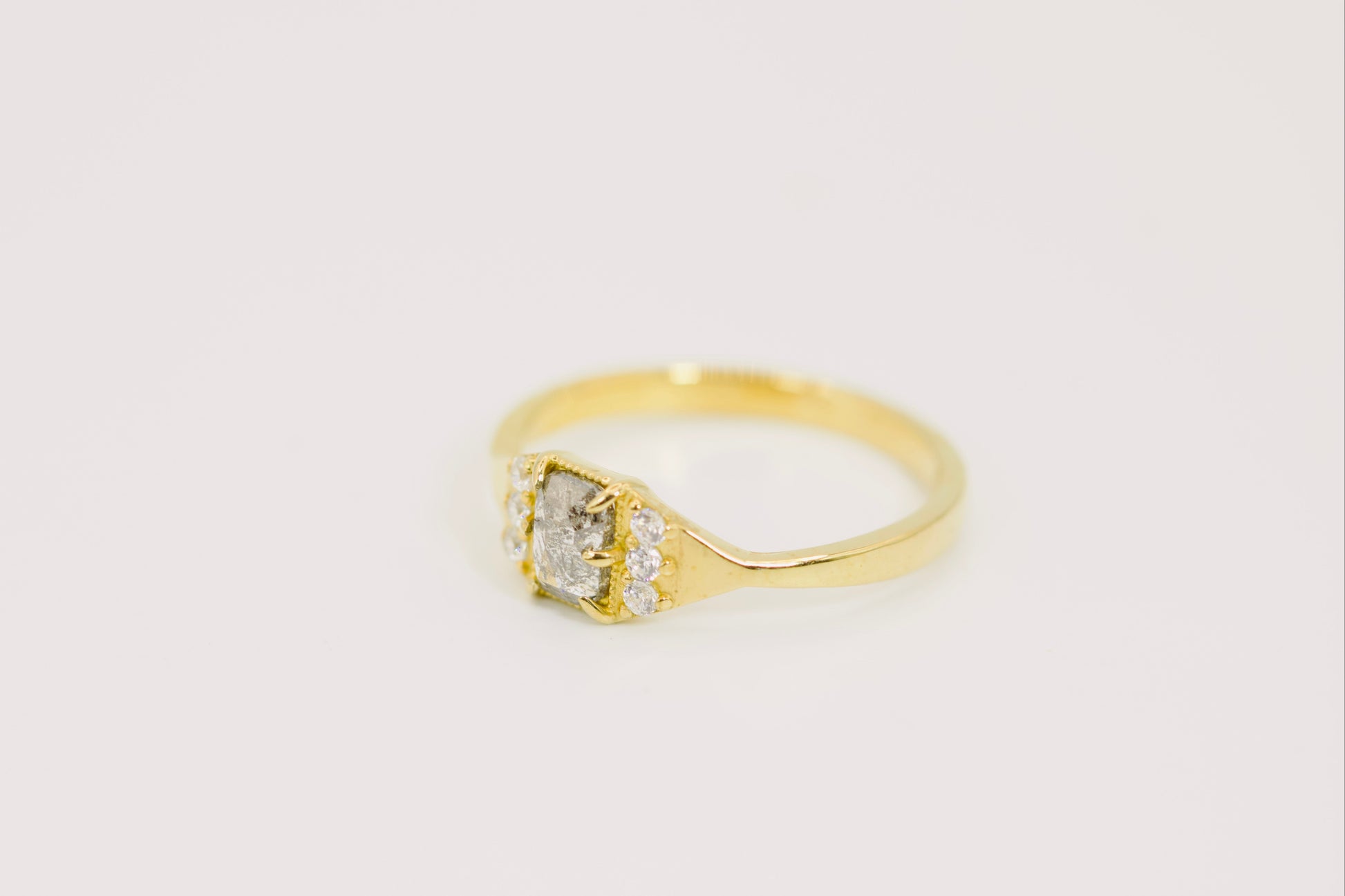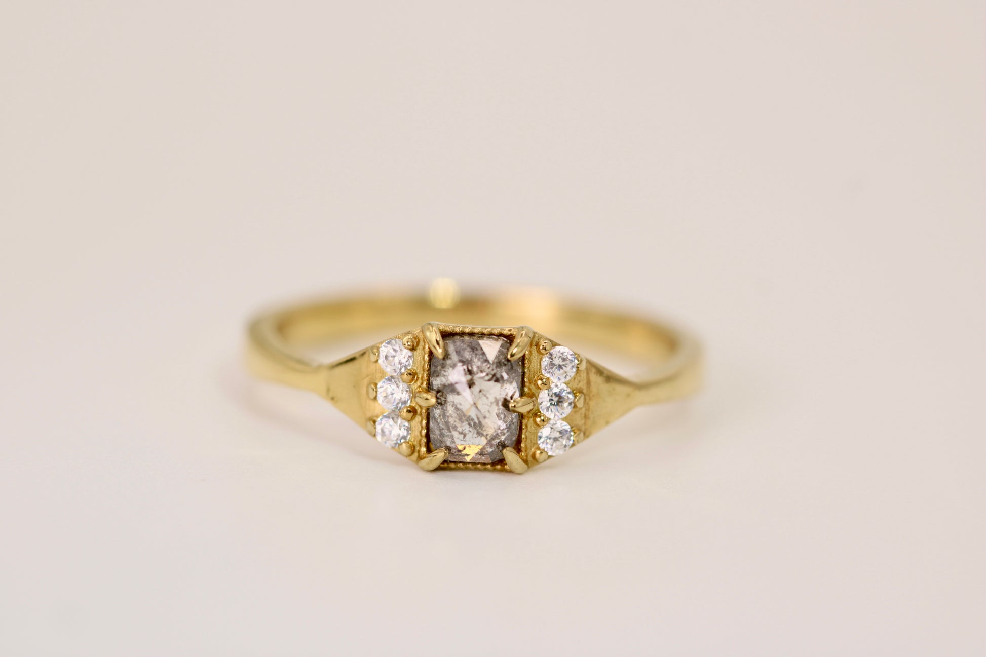 This one-of-a-kind Emma Ring showcases a striking rose cut salt and pepper rectangle diamond as its centerpiece, celebrated for its natural inclusions and distinctive character. Six accent diamonds frame the stone, adding refined sparkle while allowing the main diamond to command attention. Crafted in 14k yellow gold, enhancing the diamond's unique gray and white tones. Perfect for those seeking an unconventional engagement ring or statement piece with genuine individuality and elegance.