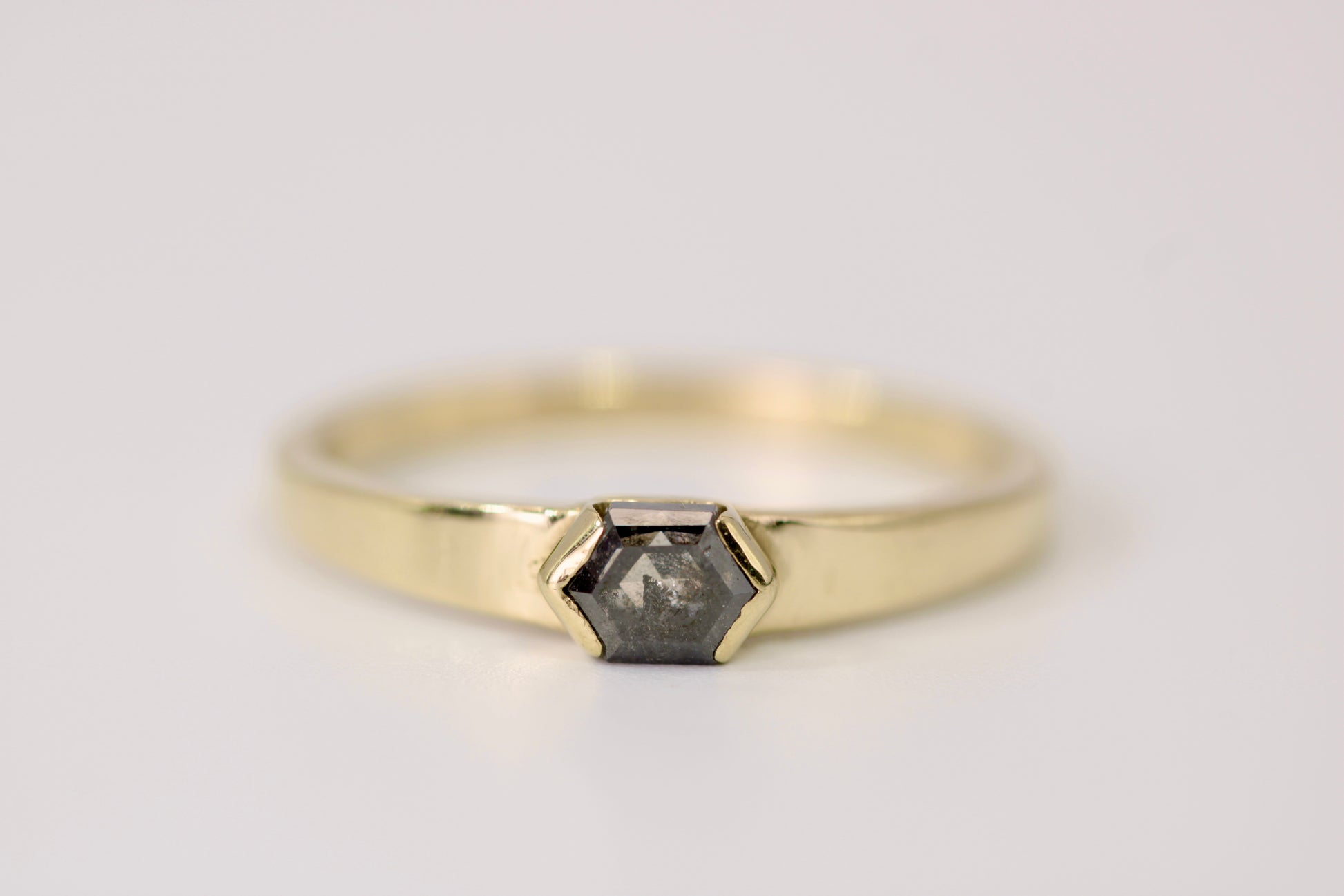 The Gaia Ring features a distinctive salt and pepper hexagon diamond, elegantly secured with a half bezel setting for a modern yet timeless appeal. Crafted in 14k gold, this piece balances durability with refined sophistication.