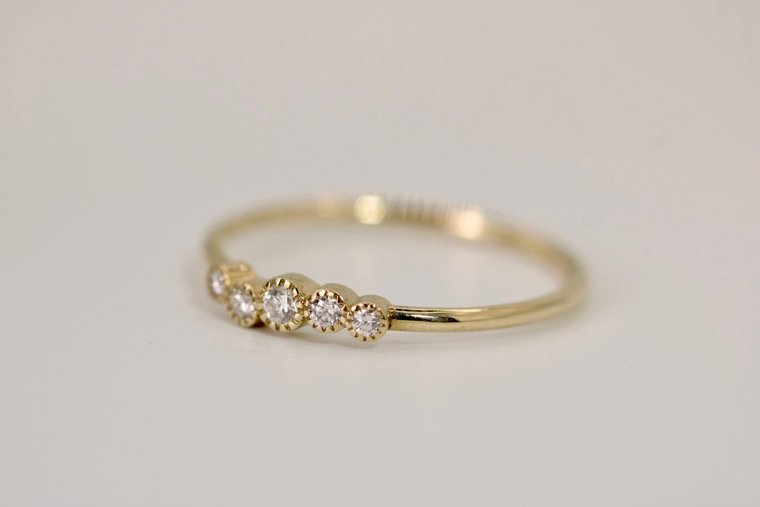 14K yellow gold ring with five natural diamonds in a bezel setting that blend security with refined aesthetics. An elegant design suitable for both everyday elegance and milestone moments.