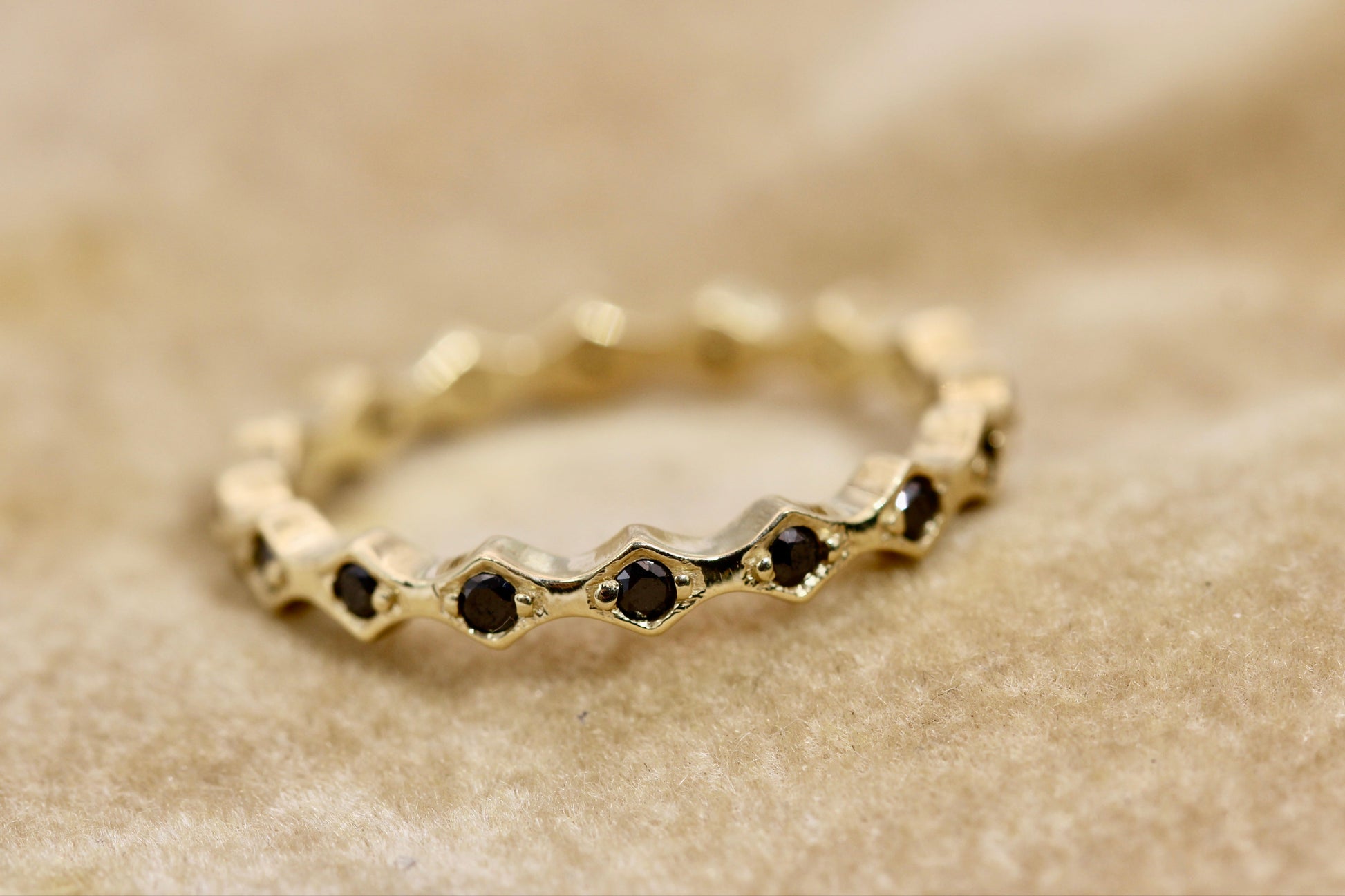 An elegant eternity band featuring black diamonds set in a refined gold band. Designed for stacking, this ring offers versatile sophistication, allowing you to create a personalized look that complements any style. Its expert craftsmanship ensures lasting beauty and a striking contrast between the deep black stones and warm gold, making it a timeless addition to your jewelry collection.