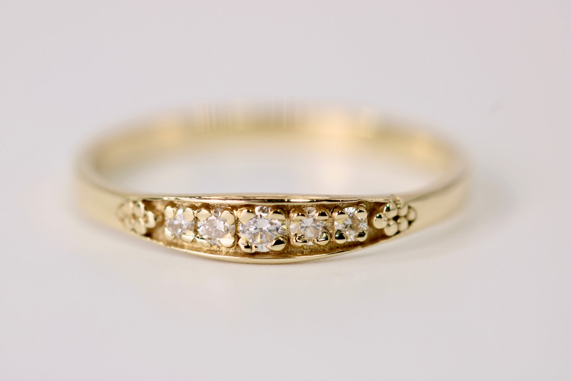 5 diamonds securely set in a yellow gold band.