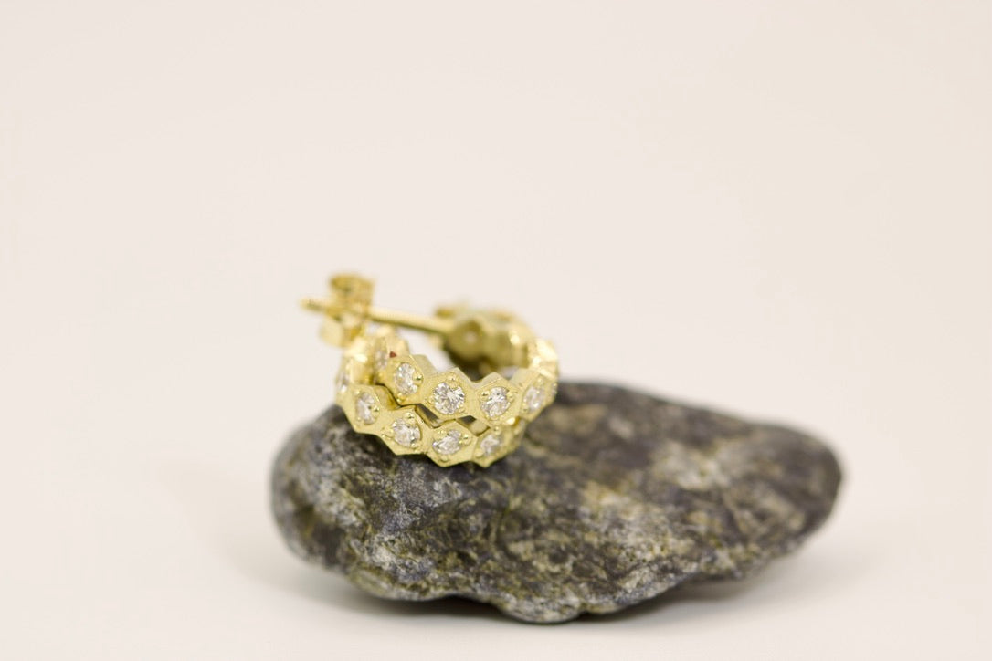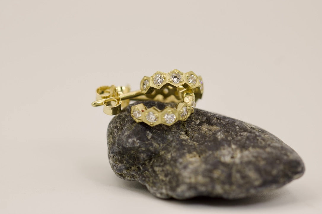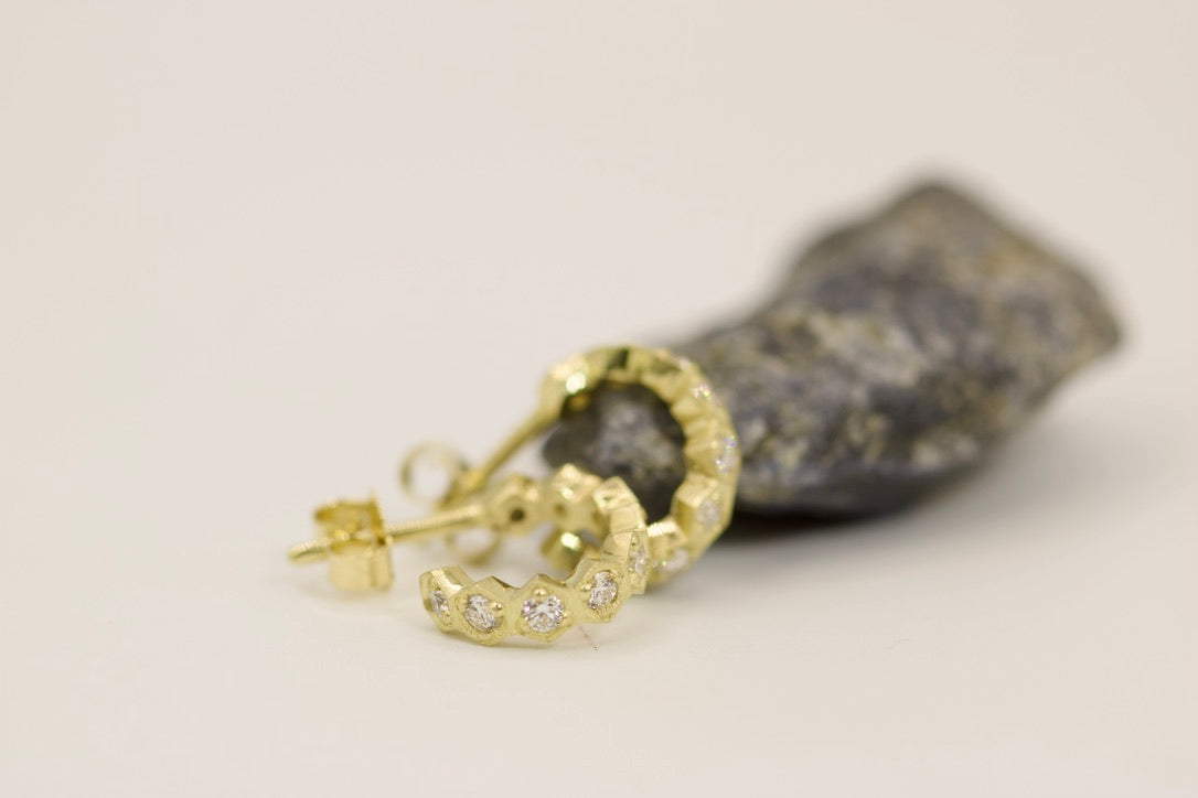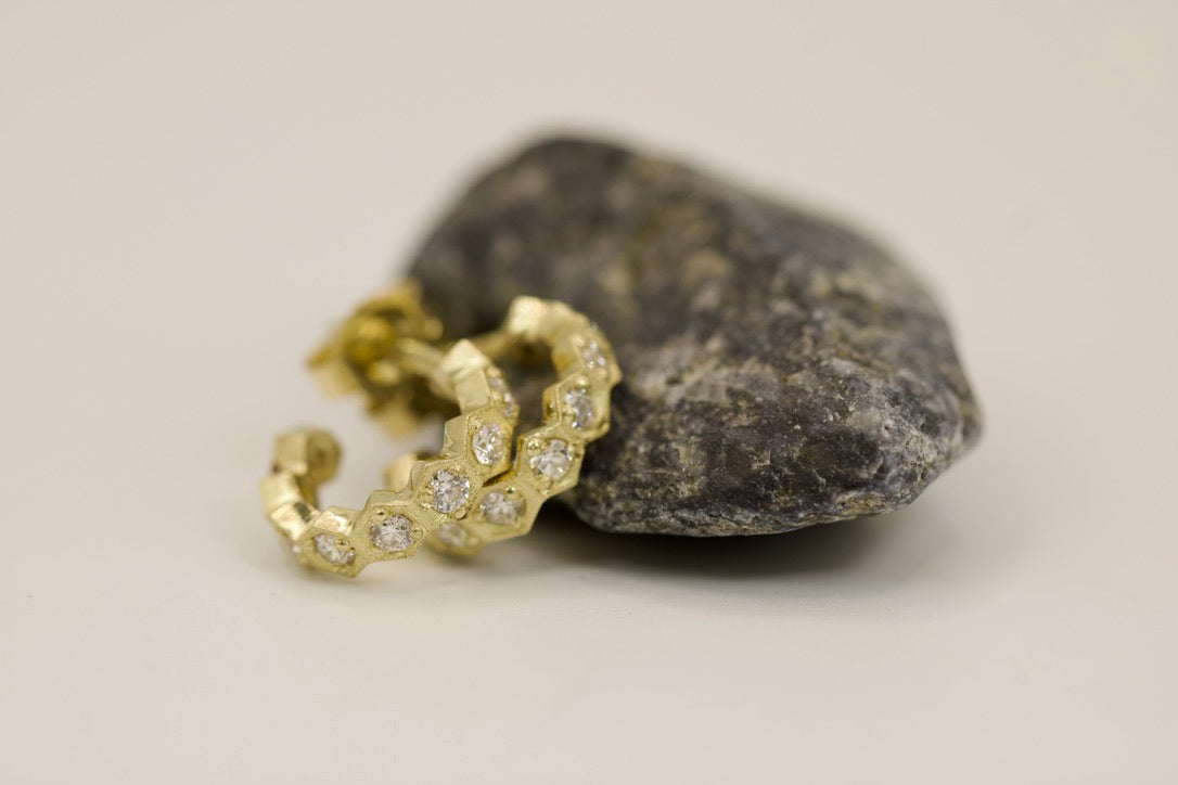 These 14k yellow gold C-hoop earrings showcase a total of 18 VS1 diamonds arranged in an elegant hexagon setting, delivering exceptional clarity and radiance. The geometric hexagon frames each stone with precision, amplifying their brilliance while maintaining a refined aesthetic.
