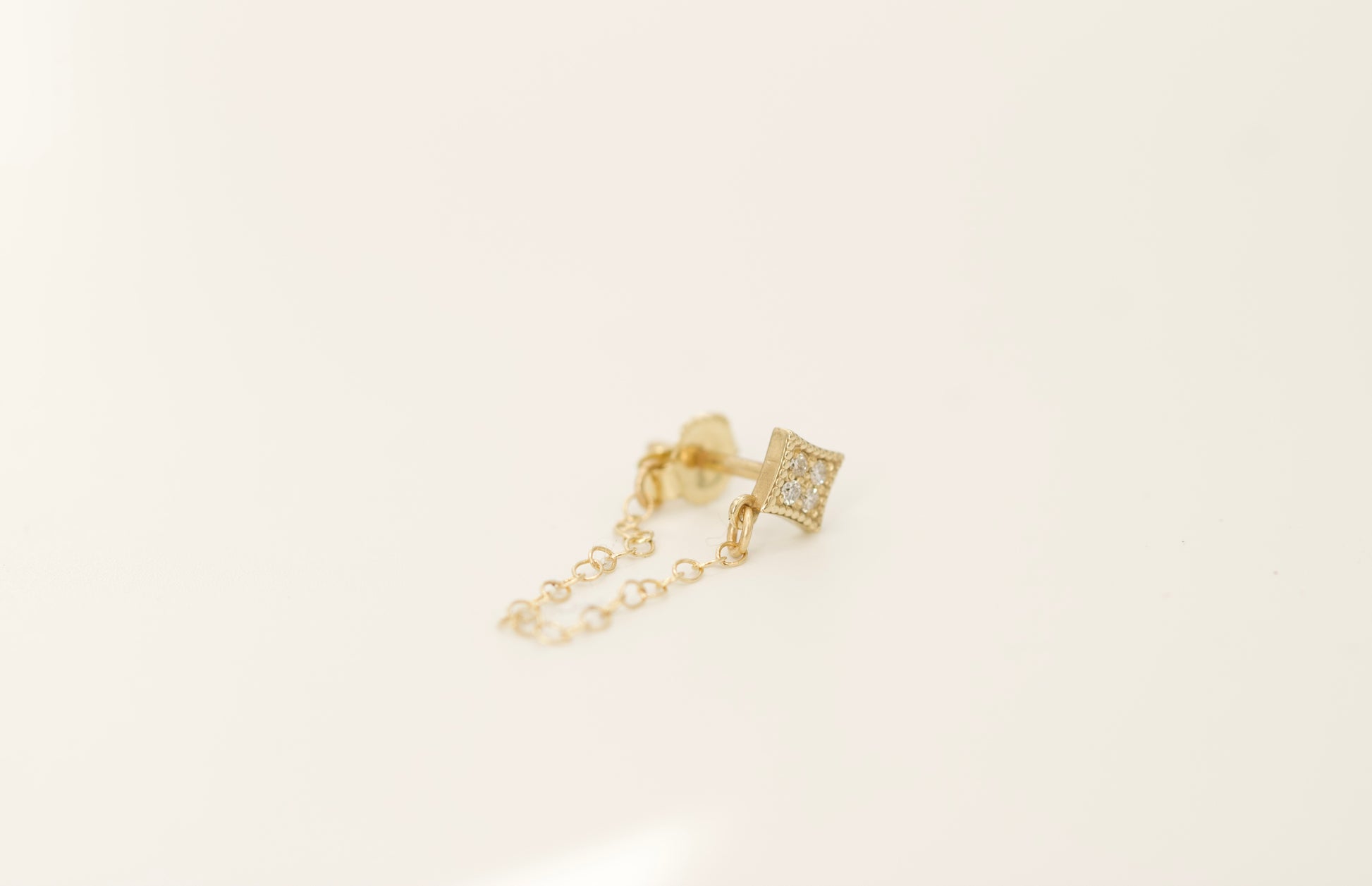 14k yellow gold square stud featuring four brilliant diamonds set within a refined milgrain border. The delicate chain dangle adds graceful movement while maintaining understated elegance. Perfect for everyday wear or layering, this piece combines classic geometry with timeless craftsmanship.