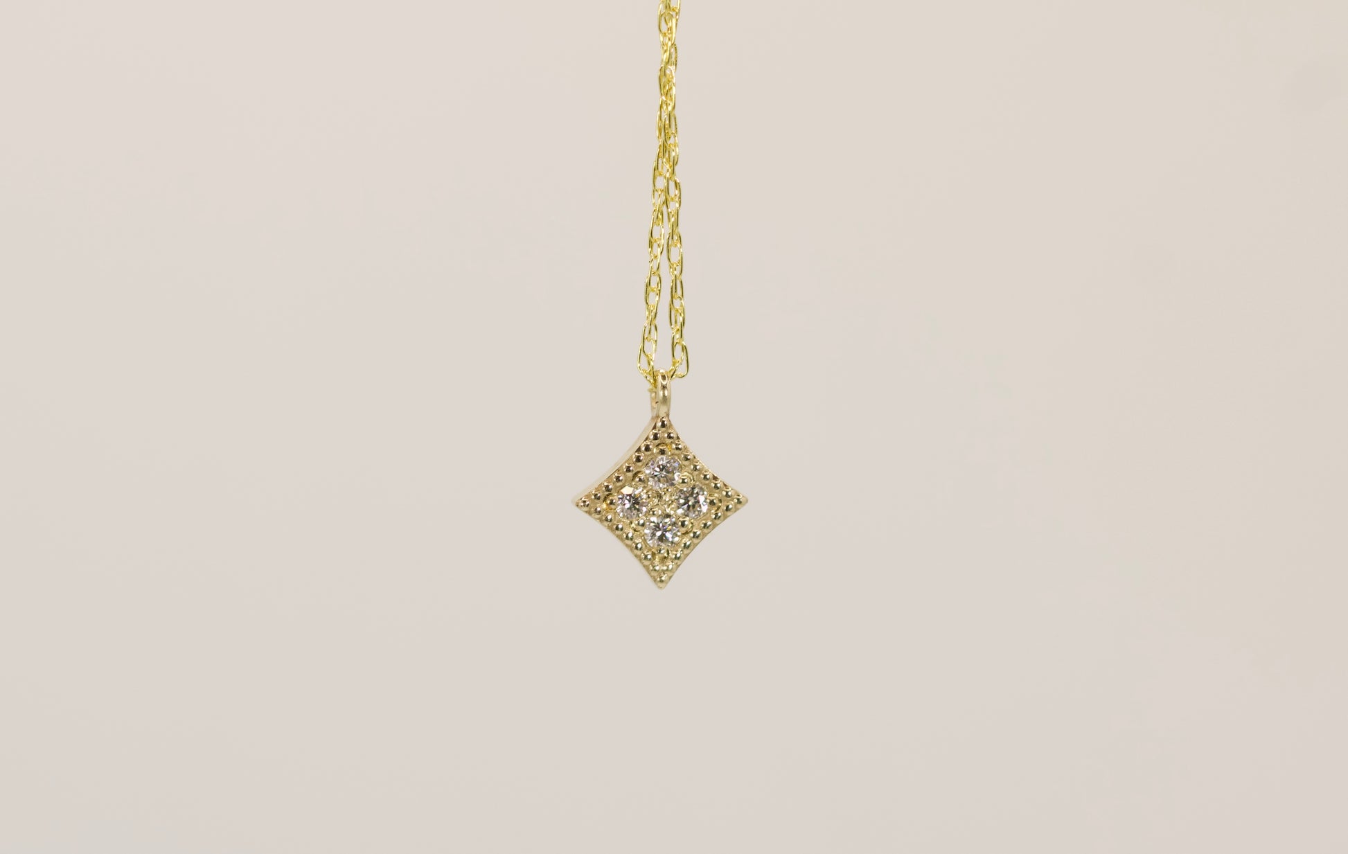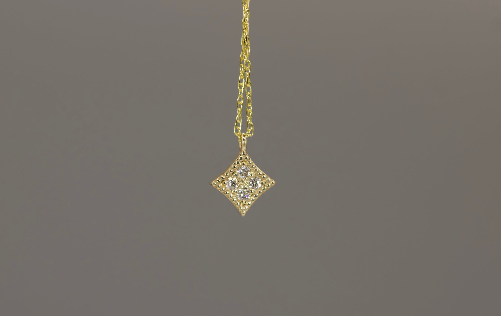 Delicate square gold pendant with 4 white diamonds and a milgrain edge for added sparkle.